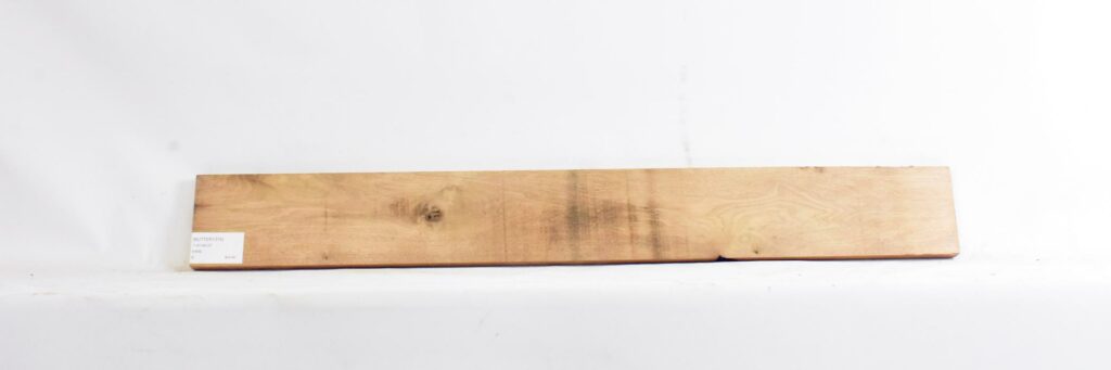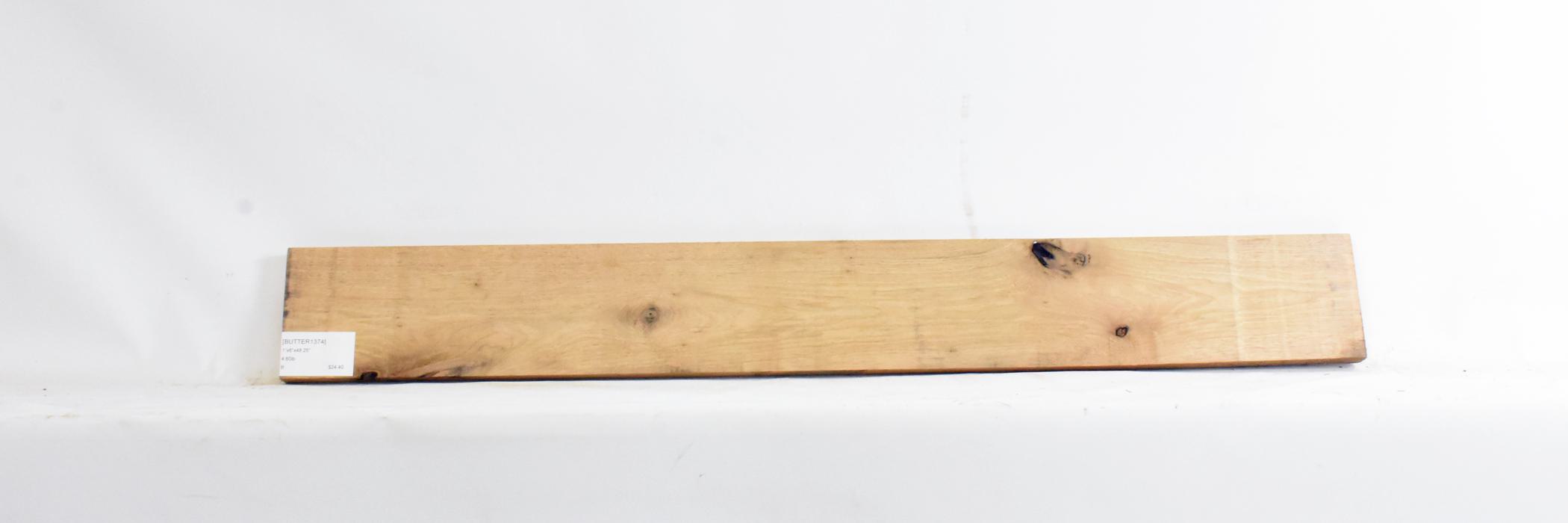 edge defect, small worm holes, light discoloration along board, check in center of board.