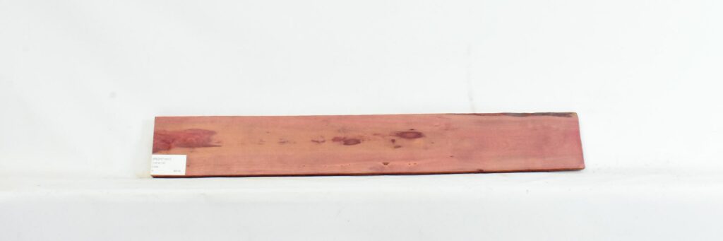 edge defects, knots, excellent deep red color, small bark inclusions, minor planing defects.